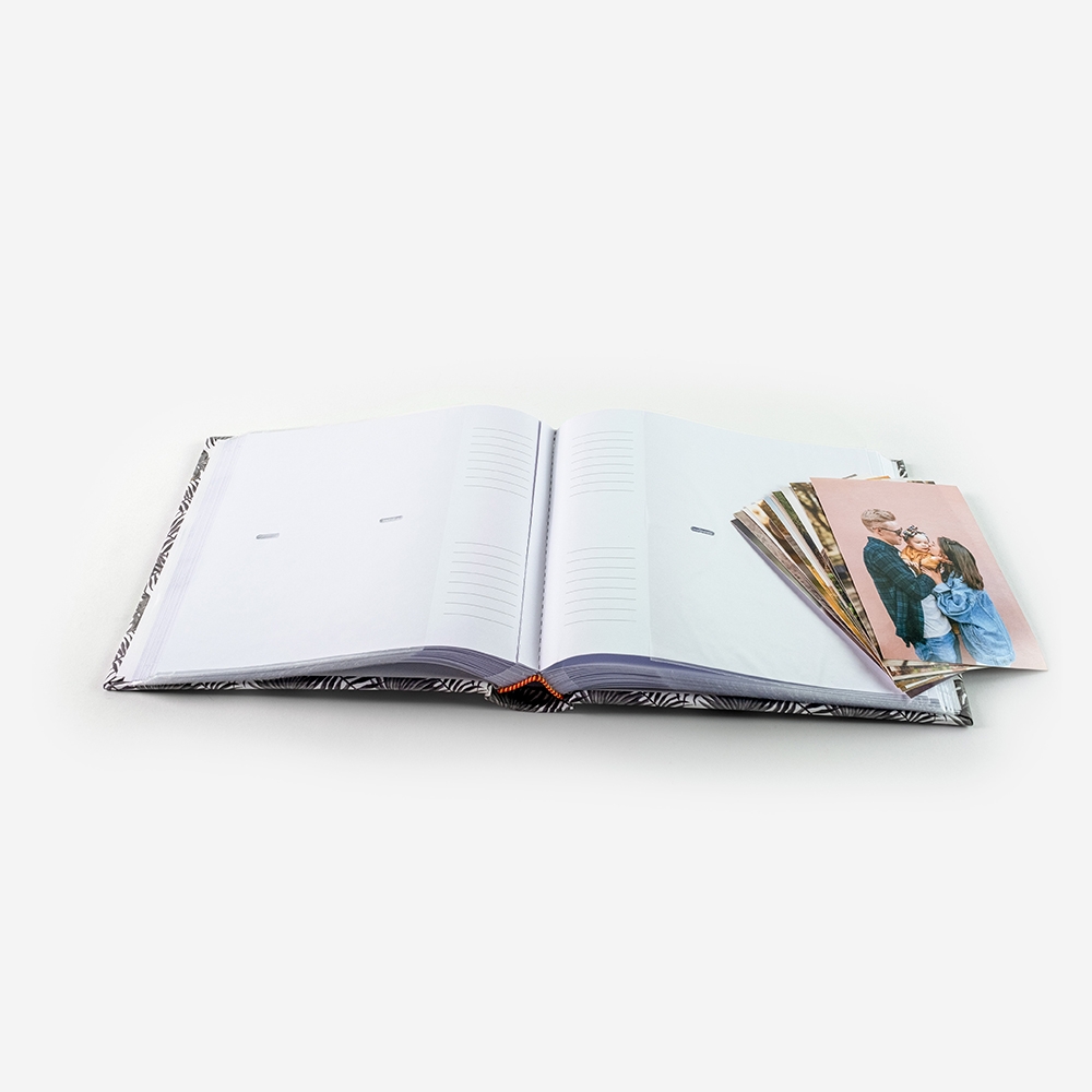 O álbum de fotos Tropical comporta 200 fotos de tamanho 10x15cm, com espaço para duas fotos e uma seção de anotações em cada página.