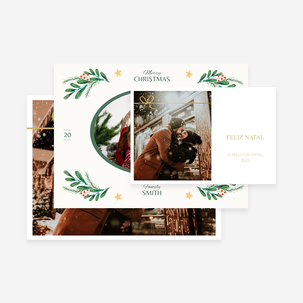 Os postais de Natal são um excelente complemento à surpresa que pretendes proporcionar aos teus familiares e amigos e para enviar às pessoas que infelizmente não podem passar o Natal em família por estarem longe, sobretudo aqueles que por razões profissionais residem noutros países. Nestes casos, os Postais assumem ainda mais significado, uma vez que conseguem levar algum conforto e amor, através das palavras e de fotografias. Podes criar o teu Postal de Natal de raíz ou escolher um dos modelos disponíveis no nosso editor online. Encontras vários temas com elementos de Natal diversificados, como a coroa natalícia, o pinheirinho, o simples ho, ho, ho e muitos mais. Podes aproveitar a tua foto favorita da sessão de natal para personalizar um postal e surpreender todos os familiares e amigos.